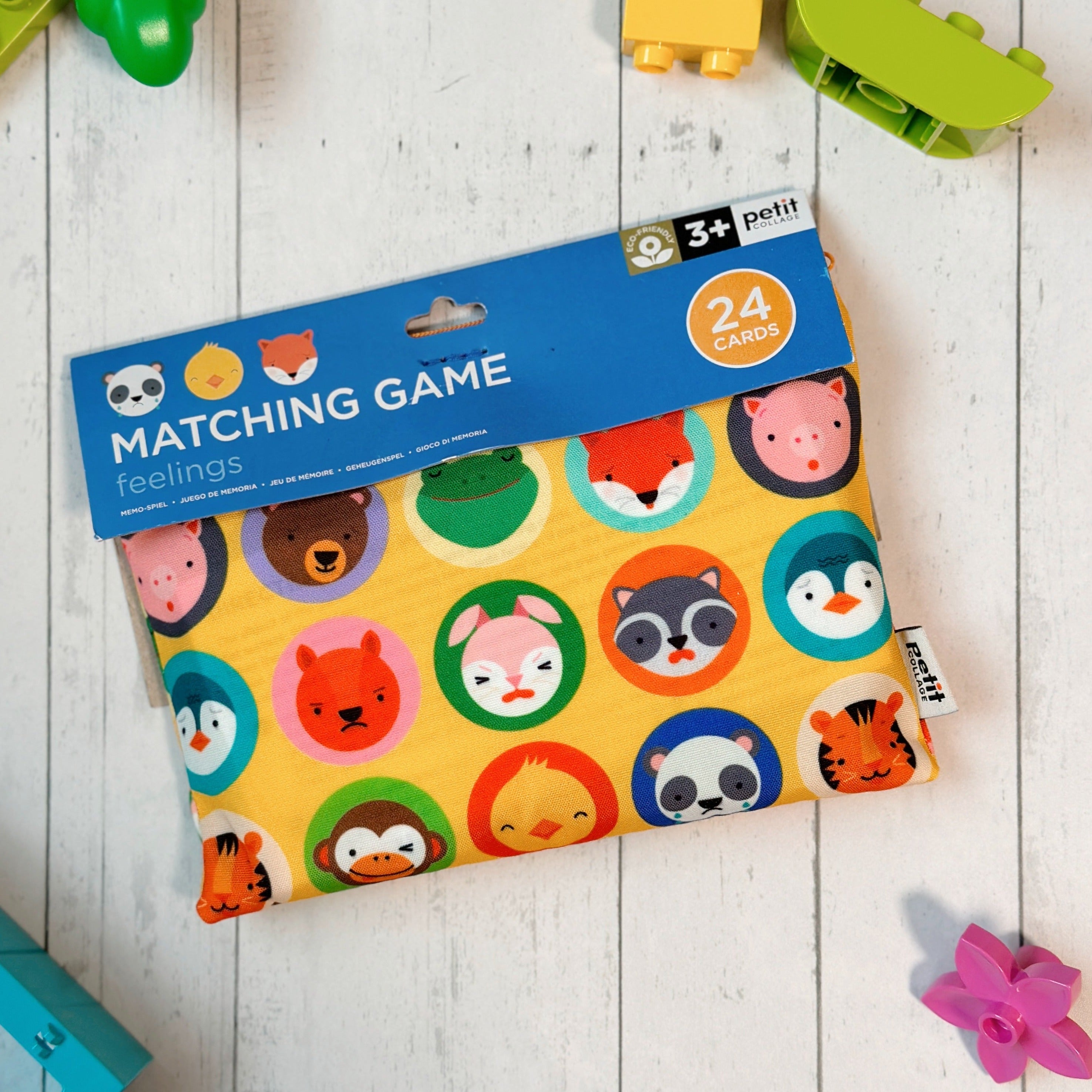 The Feelings Matching Game from Petit Collage is the perfect preschool matching card game. It’s a fun and exciting learning game for kids that features 12 pairs of animal faces featuring expressions with different emotions and feelings. Can you match them all? Ideal for ages 3+, this memory game is more than just fun—it also promotes visual recognition and memory skills. This classic matching game for kids is packaged in a pouch that makes it easy to keep all of the pieces safe and together, as well as being travel-friendly!