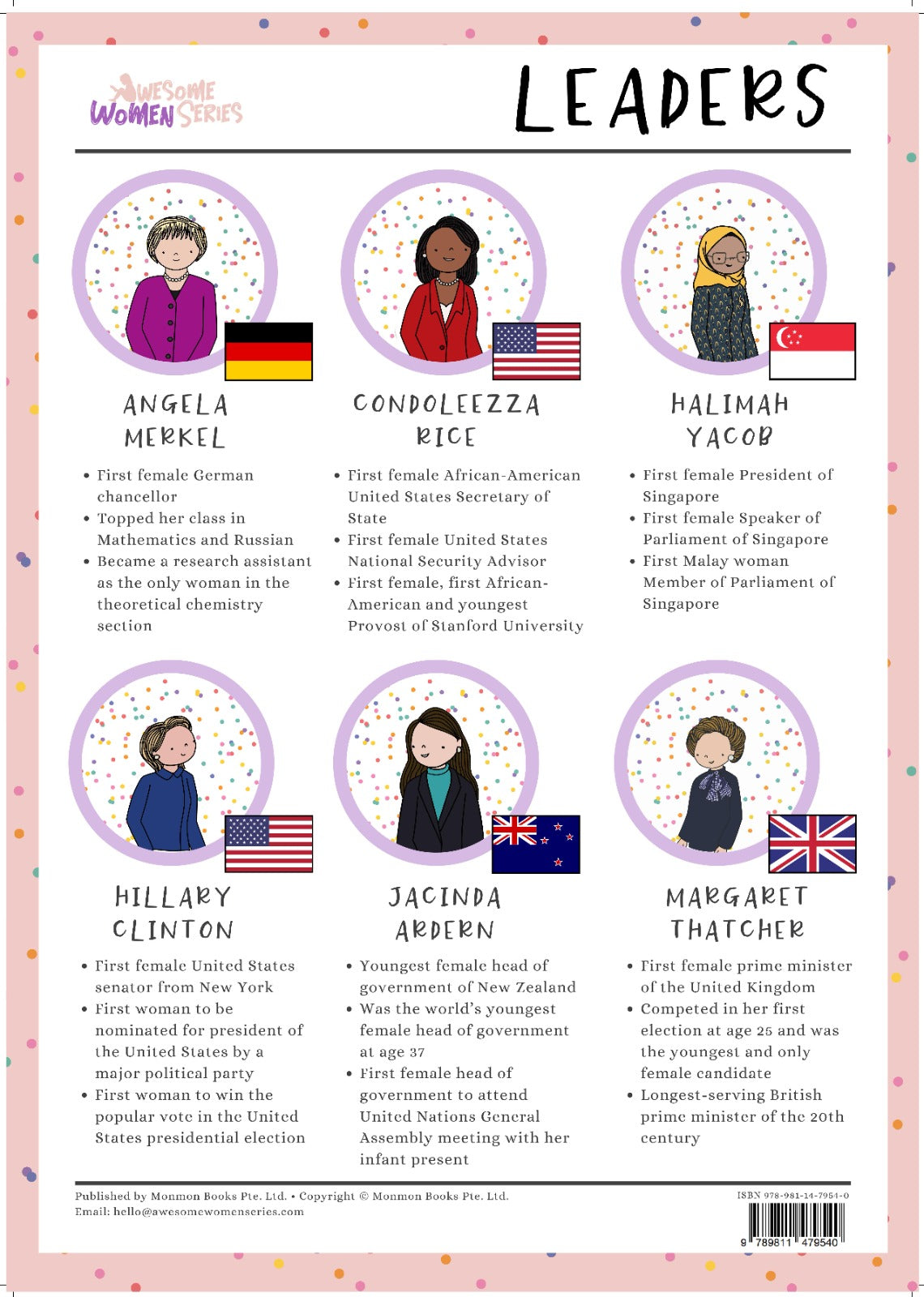This is a poster based on our first category of the Awesome Women Series - the Leaders box set. It features six female Leaders (in government, politics, and international organizations) who made a positive impact on society.