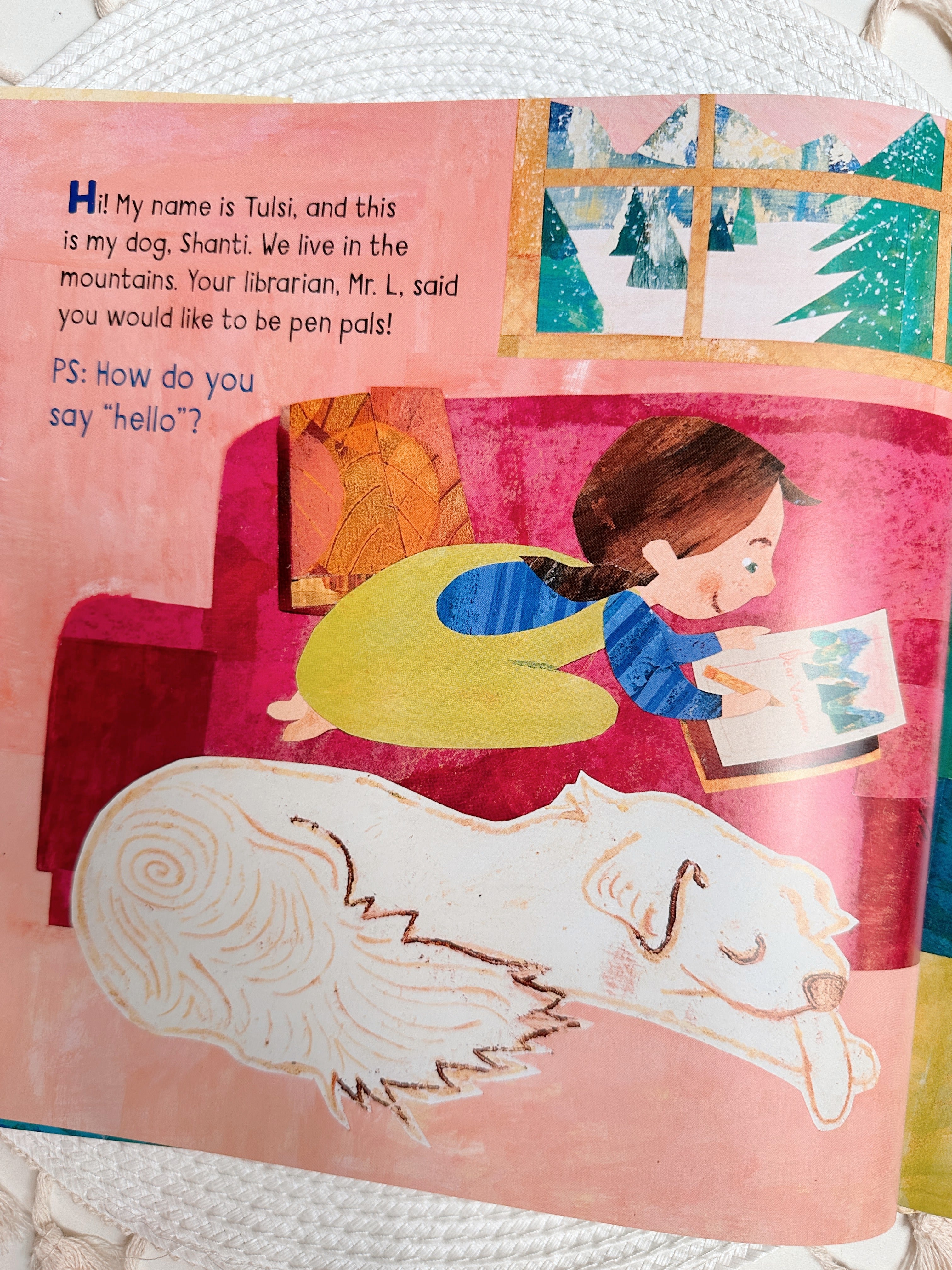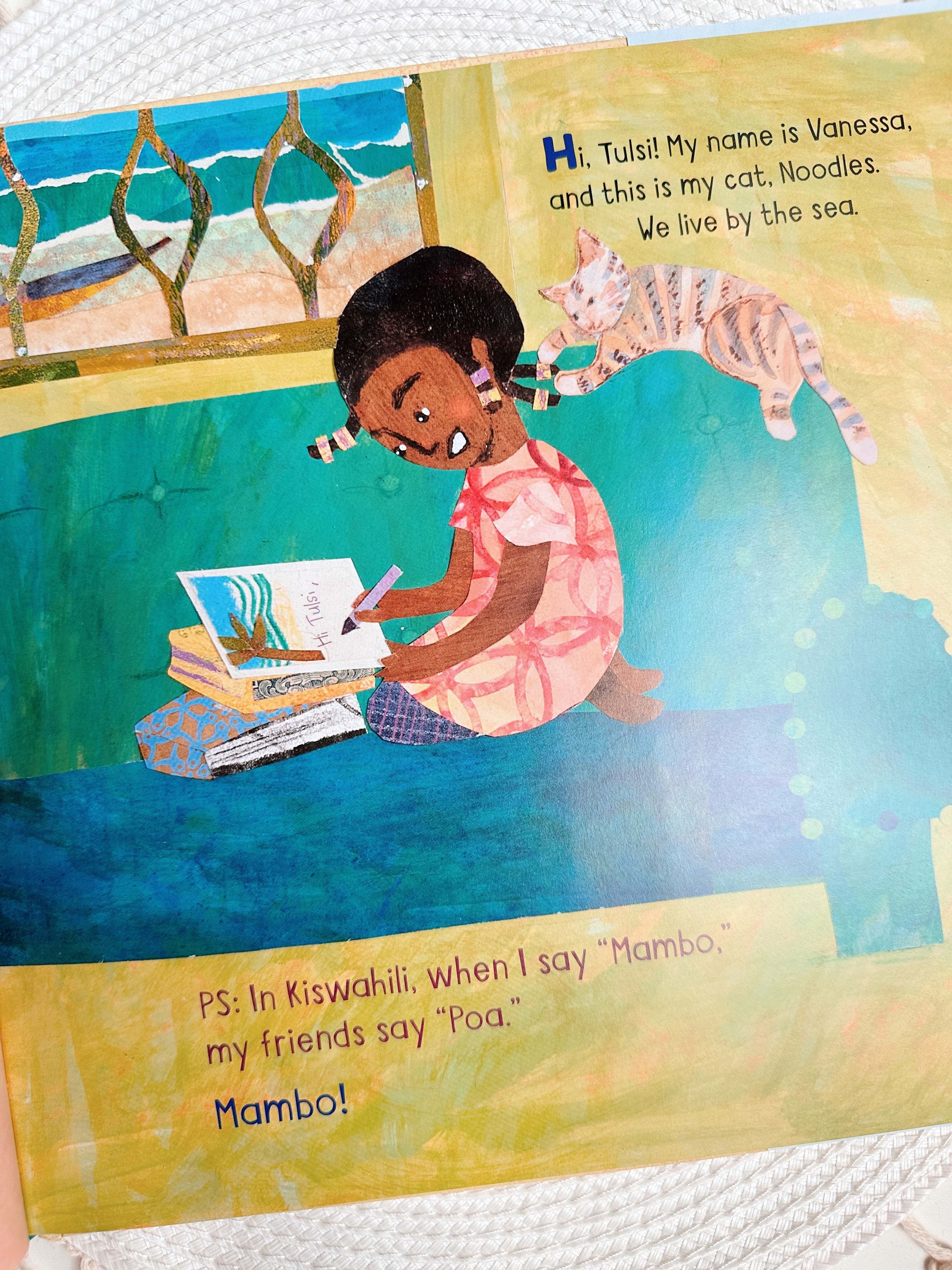 Tulsi and Vanessa live on separate continents—one in the mountains in North America, and the other beside the sea in Africa. By exchanging letters, they learn that they both have prankster brothers, love music, and collect treasures from nature. Their daily sights and sounds may be different, but their feelings about their experiences hold many similarities.